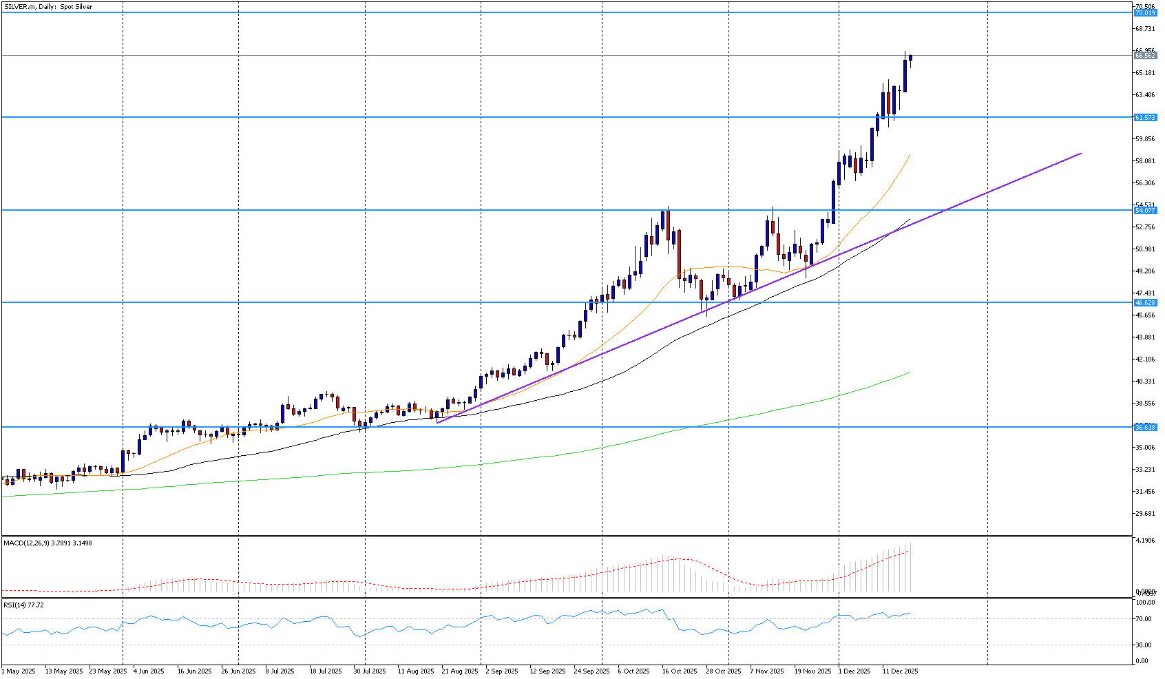 Díky tomu, že EMA stále setrvává ve formaci Golden Cross a RSI se pohybuje v neutrální až býčí zóně, dnes stříbro může pokračovat v růstu směrem k nejbližším úrovním rezistence. -