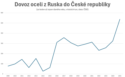 Česká republika letos prudce navyšuje dovoz oceli z Ruska, na suverénní historický rekord. Od ledna do srpna dovezla přes 537 tisíc tun této suroviny, meziročně o 43 procent více, vyplývá z dat ČSÚ (viz liniový graf níže). Hodnota tohoto dovozu dosáhla zhruba 6,7 miliardy korun. Česko tak nadále pomáhá financovat ruské válčení na Ukrajině, přestože od přímého odběru ruské ropy a zemního plynu se již odstřihlo. -