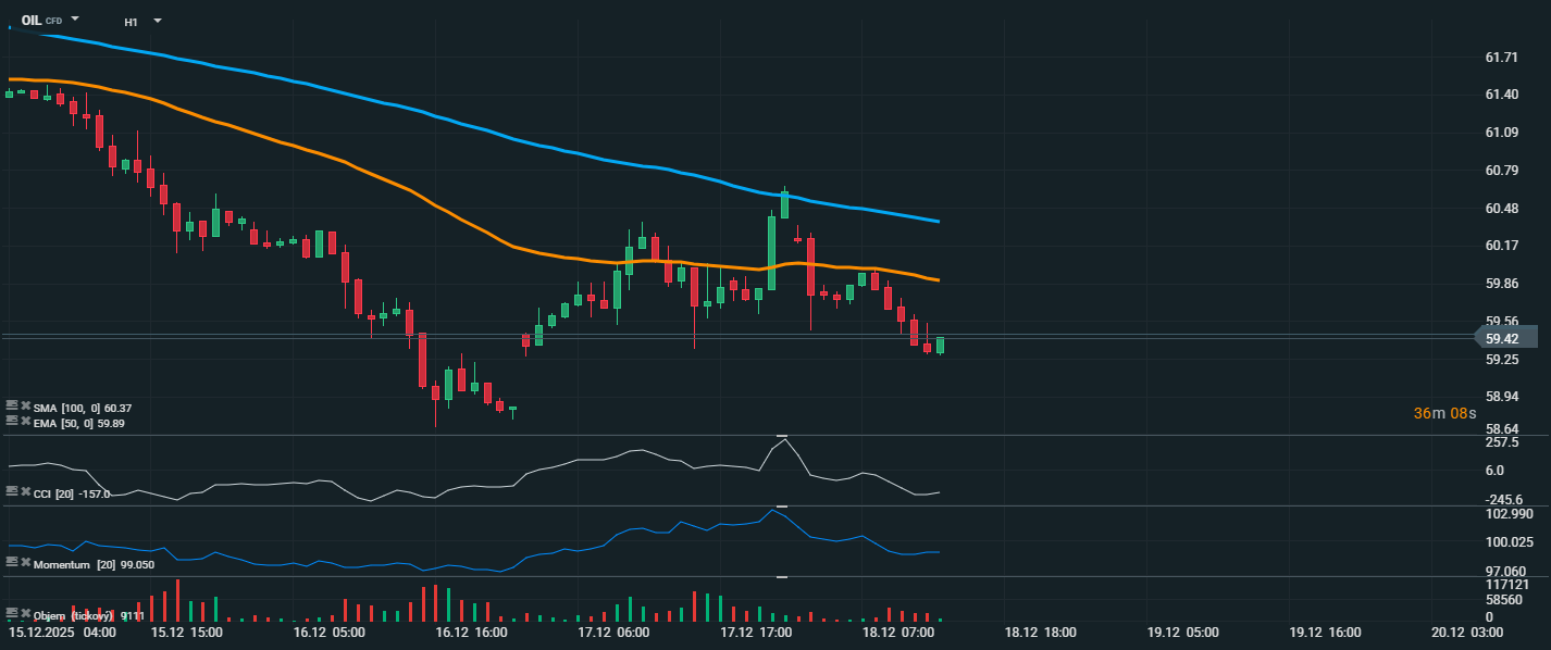 Cena ropy se aktuálně obchoduje kolem úrovně 59,42 USD, přičemž trh se nadále nachází v sestupném trendu. Tento vývoj potvrzuje skutečnost, že se cena drží pod oběma klouzavými průměry – EMA 50 na úrovni 59,89 USD a SMA 100 na 60,37 USD. Tyto průměry fungují jako rezistence a brání rozvoji růstového momenta. CCI dosahuje extrémní hodnoty -157, což značí silné přeprodané pásmo. Tento stav může krátkodobě naznačovat možnost technického odrazu, ale celkové momentum zatím zůstává negativní. Momentum osciluje pod hladinou 100 a potvrzuje pokles dynamiky růstu. Objem obchodů zůstává zvýšený, zejména během propadů, což poukazuje na aktivitu prodejců a pokračující výprodejový tlak. Po pokusu o proražení nad EMA 50 se cena rychle vrátila pod tuto úroveň, čímž došlo k potvrzení falešného průrazu.