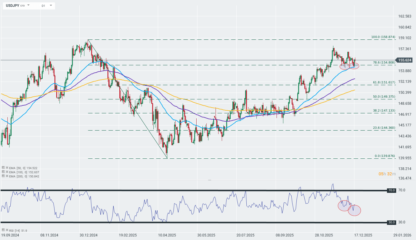 Při pohledu na dlouhodobý graf měnového páru USDJPY vidíme, že navzdory rostoucím spekulacím o zpřísnění měnové politiky v Japonsku si samotný jen vede relativně slabě a nadále udržuje technický downtrend. Zajímavé je, že při pohledu na svíčkový pattern z posledních dvou týdnů lze pozorovat divergenci mezi cenou a indikátorem RSI, což může naznačovat, že uptrend indikovaný 50denním EMA se blíží ke konci.
