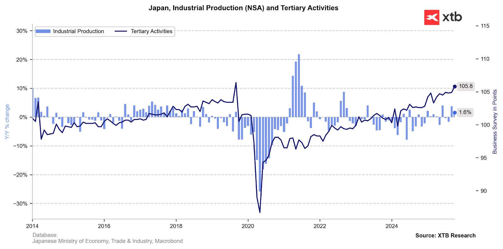 Navíc objem klíčových strojírenských objednávek překonal očekávání a dosáhl nejvyšší úrovně od září 2022 (+12,5 %, odhad 3,6 %, předchozí 11,6 %), což je další signál rostoucích kapitálových výdajů japonských firem.