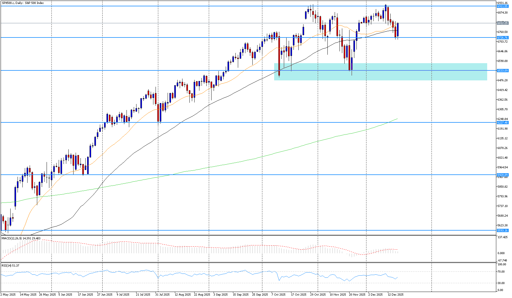 Americký hotovostní index SP500 se po čtyřech po sobě jdoucích poklesech vrací k růstu, když investoři přizpůsobují své pozice před zveřejněním klíčové listopadové zprávy o inflaci v USA. Očekává se, že data potvrdí přetrvávající cenové tlaky nad cílovou úrovní Federálního rezervního systému, což udržuje trhy v opatrném režimu. Přesto aktuální oživení naznačuje, že část prodejního tlaku může být již vyčerpána. Z technického pohledu se index snaží stabilizovat a klíčovou překážkou zůstává oblast kolem 6 800 bodů, kde se sbíhají 20denní a 50denní jednoduchý klouzavý průměr. Úspěšné překonání této zóny by výrazně zlepšilo krátkodobý výhled a mohlo by nasměrovat pozornost trhu zpět k historickému maximu na úrovni 6 923 bodů. Mírně nad touto hranicí se navíc nachází psychologická úroveň 7 000 bodů, která zároveň odpovídá 161,8% Fibonacciho rozšíření poklesu z období od února do dubna. Na opačné straně trhu zůstává první významnou podporou dlouhodobá vzestupná trendová linie v oblasti kolem 6 600 bodů. Pokud by prodejní tlak znovu zesílil, další důležitou úrovní by byla bariéra poblíž 6 508 bodů, jejíž prolomení by mohlo otevřít prostor pro hlubší korekci. Technické oscilátory naznačují, že trh mohl krátkodobě dosáhnout přeprodaných úrovní. RSI se začíná stáčet vzhůru těsně pod hranicí 50, zatímco stochastický oscilátor roste z oblasti pod 20. Tyto signály podporují scénář krátkodobého oživení. Celkově SP 500 vykazuje první známky stabilizace, přičemž rozhodující pro další směr bude schopnost udržet růst nad oblastí 6 800 bodů.