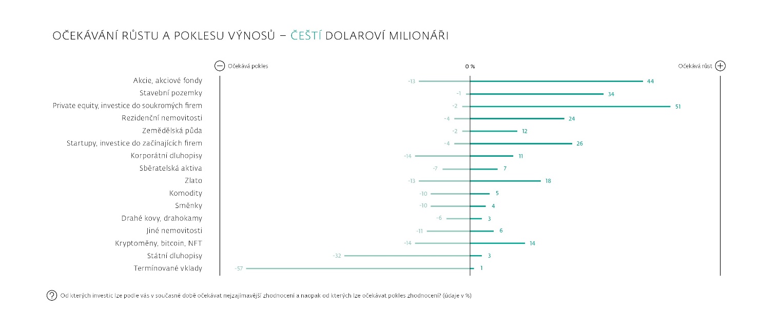 Česká populace obecně pro rok 2026 očekává nejvyšší zhodnocení od zlata a kryptoměn, zatímco dolaroví milionáři věří více v růstový potenciál investic do firem mimo burzu. Za poslední dva roky přišli úspěšní na chuť private equity. Ještě v roce 2023 v tyto střednědobé investice věřila zhruba čtvrtina bohatých respondentů, dnes už je to více než polovina.