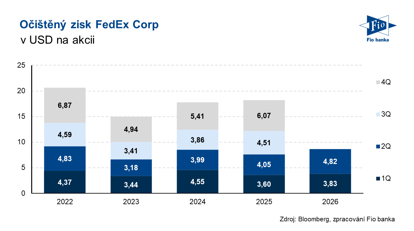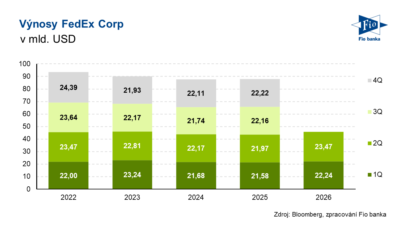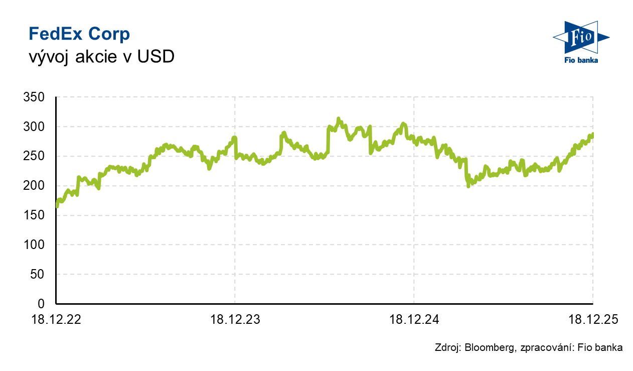 Americká logistická společnost FedEx včera po uzavření trhu zveřejnila výsledky hospodaření za 2Q fiskálního roku 2026, jenž skončil 30. listopadu 2025. Výnosy, které meziročně vzrostly o 6,8 % na 23,5 mld. USD, i očištěný zisk na akcii byly nad odhady analytiků. Společnost upravila celoroční výhled, avšak podle analytičky Stephanie Moore z Jefferies v menším rozsahu, než by odpovídalo překonání očekávání ve 2Q. Podle ní firma čelí řadě nákladových tlaků, včetně uzemnění letadel MD-11.