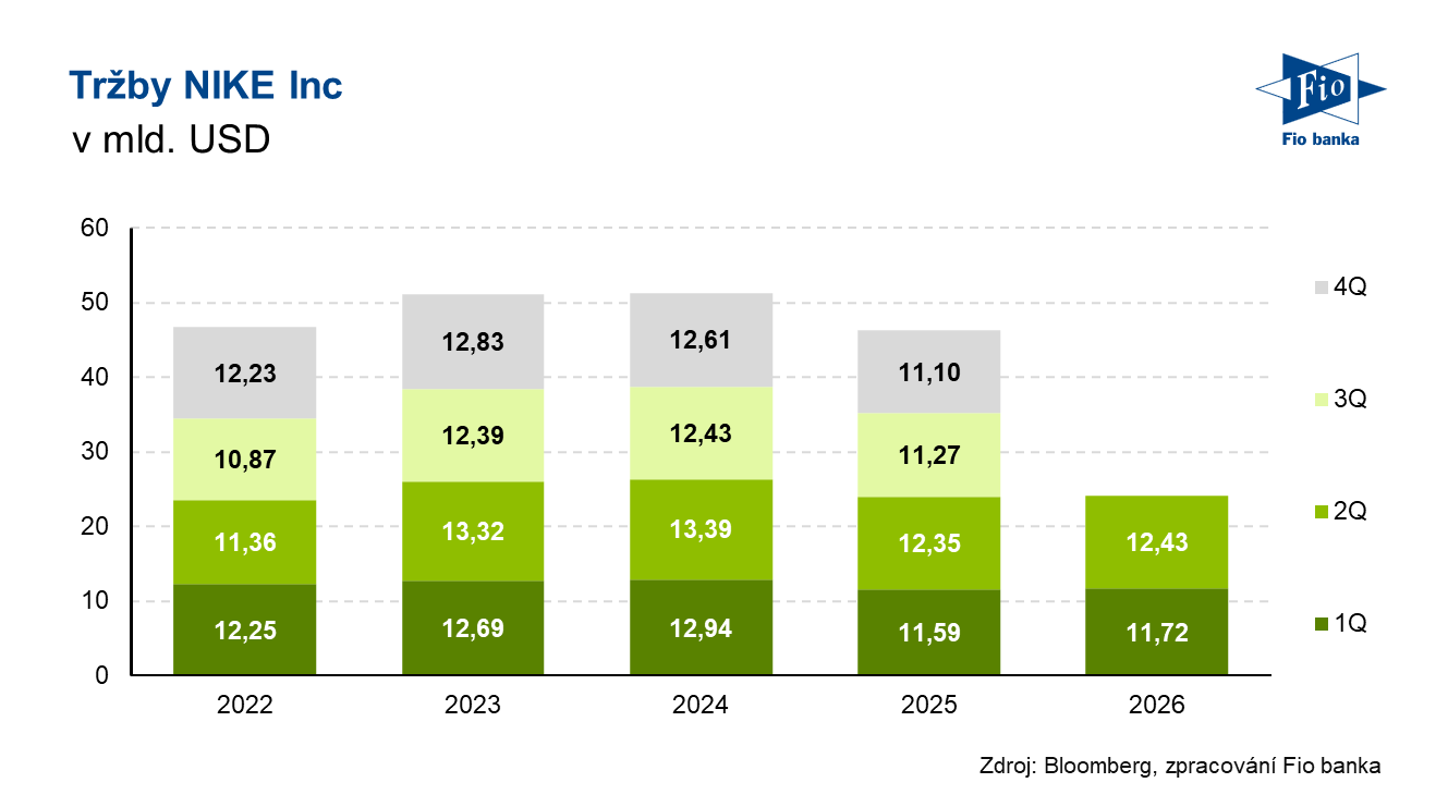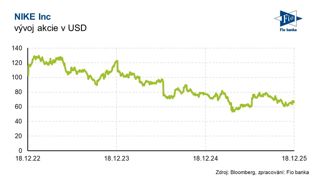 Výrobce sportovního oblečení Nike reportoval výsledky za druhý kvartál fiskálního roku 2026, který skončil 30. listopadu 2025. Celkové tržby společnosti vzrostly meziročně o 0,6 % a byly mírně nad očekávání trhu. Tržby v regionu Velké Číny (Čína, Hongkong, Macao, Tchaj-wan) sledovaly pokles o 17 %. Zisk na akcii činil 0,53 USD, což představuje meziroční pokles o 32 %. Dle CEO společnosti Elliotta Hilla je Nike v polovině cesty svého návratu. Pokles tržeb skrze digitální platformy zpomalil z -21 % na -14 %.