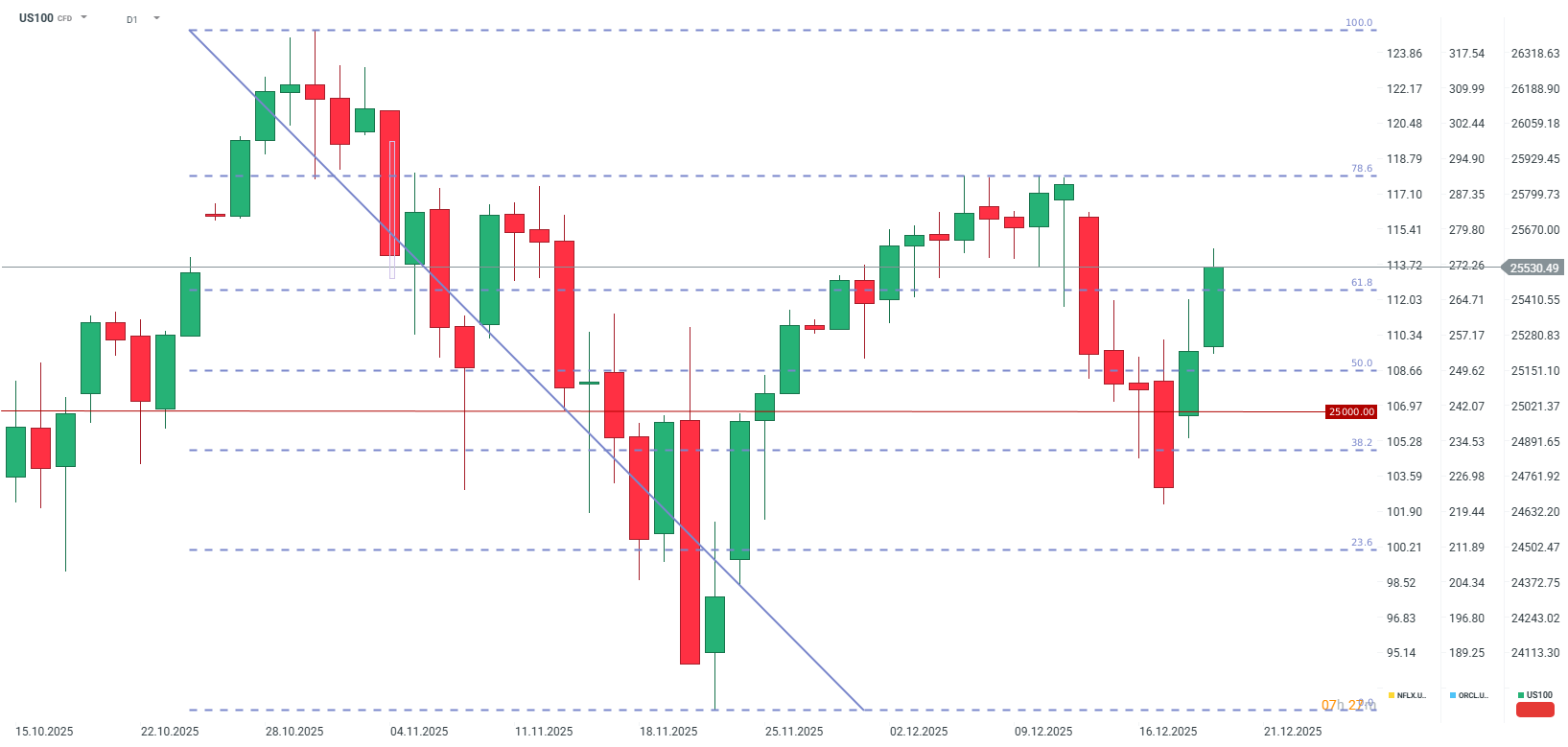 US100 dnes posiluje o 1 % a navazuje na čtvrteční zisky. Po nedávném přerolování kontraktů index testuje úroveň 25 500 bodů. Udržitelný průraz nad tuto hranici by znamenal nové týdenní maximum a posunul by měsíční výkonnost zpět do kladného teritoria, čímž by zvrátil nejistý sentiment z první poloviny prosince.