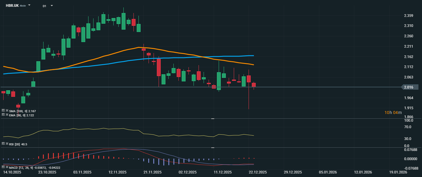 Akcie společnosti Harbour Energy se po oznámení akvizice americké LLOG Exploration za 3,2 miliardy USD dostaly pod výrazný tlak. Na grafu vidíme, že cena prudce oslabila a propadla se pod úroveň 2,00 GBP, kde uzavřela na hodnotě 2,016 GBP. Klouzavé průměry SMA 100 (2,167 GBP) a EMA 50 (2,122 GBP) jsou aktuálně nad cenou akcie, což potvrzuje sestupný trend. EMA 50 navíc směřuje dolů, čímž naznačuje pokračující slabost. Proražení pod obě tyto úrovně koncem listopadu znamenalo změnu sentimentu z býčího na medvědí. RSI kleslo na hodnotu 40,5, což se sice ještě nenachází v přeprodaném pásmu (pod 30), ale signalizuje rostoucí prodejní tlak a absenci nákupního zájmu.