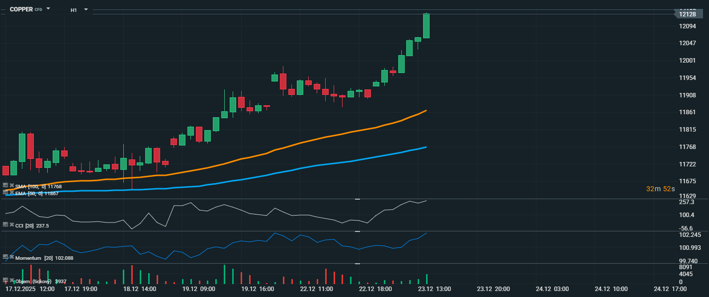 Měď na hodinovém grafu pokračuje v extrémně silném růstovém trendu, když cena právě dosáhla nového historického maxima na úrovni 12 128 USD. Pohyb je doprovázen výrazným momentem i objemem, což potvrzuje silnou nákupní vlnu. Klouzavé průměry EMA 50 (11 867 USD) a SMA 100 (11 768 USD) jasně rostou a jsou daleko pod aktuální cenou, což svědčí o silném trendu a momentálně velmi překoupeném trhu. CCI (237,5) i momentum (102,1) dosahují extrémně vysokých hodnot, což potvrzuje překoupený stav trhu, ale zároveň i intenzitu růstového impulsu. Objem obchodů výrazně vzrostl spolu s cenou, což podporuje validitu růstového pohybu.