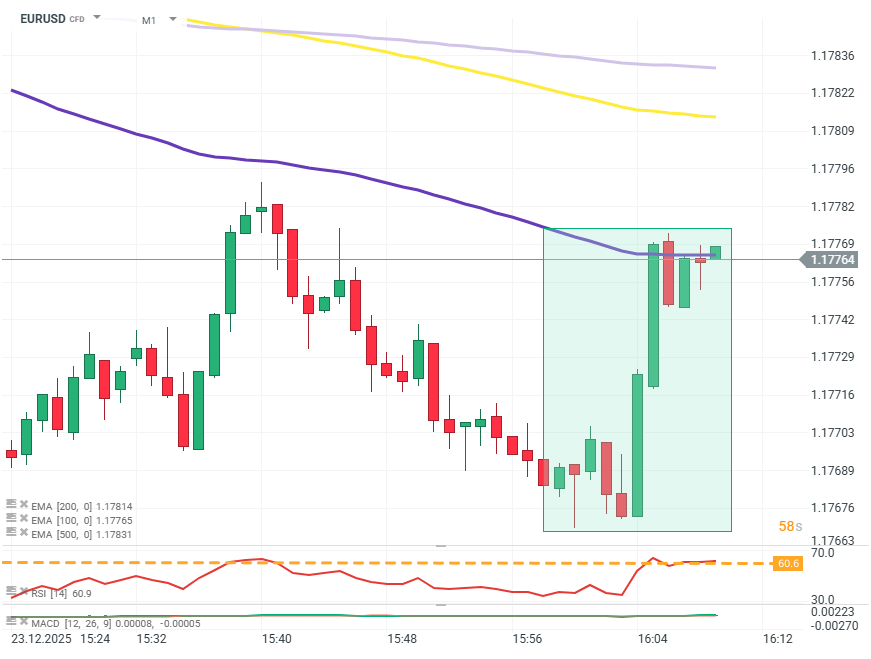 Intradenní Price Action patterny na EUR/USD 23.12.2025