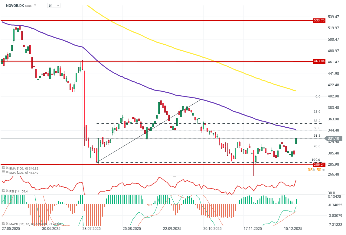 Akcie Novo Nordisk se stále obchodují výrazně pod maximy z předchozích let, ale dnešní seance přináší solidní růst. Na vlně pozitivních zpráv z FDA posilují akcie dánské farmaceutické společnosti o více než 9 %.