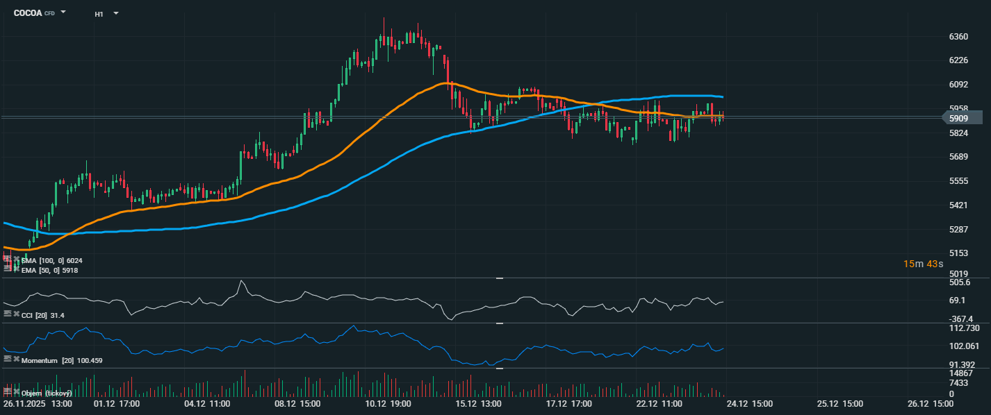 Po výrazném růstovém impulsu z první poloviny prosince přišla ostrá korekce, na kterou nyní navazuje boční konsolidace. Cena se aktuálně pohybuje kolem 5 900 USD, tedy v blízkosti krátkodobé rovnovážné zóny trhu. Z technického pohledu je klíčové, že se cena nachází mezi klouzavými průměry EMA 50 (cca 5 918 USD) a SMA 100 (cca 6 024 USD). EMA 50 je mírně klesající a funguje jako krátkodobá rezistence, zatímco SMA 100 zatím plní roli důležité střednědobé podpory. CCI se drží kolem hodnoty 31, tedy v neutrálním pásmu, což potvrzuje absenci extrémního překoupení či přeprodanosti. Momentum se nachází mírně nad úrovní 100, což signalizuje, že po předchozím oslabení dochází k postupné stabilizaci nákupního tlaku, avšak bez jasné dominance kupců. Objemové svíčky nepoukazují na zvýšený zájem ani jedné strany, což je pro konsolidační fázi typické.