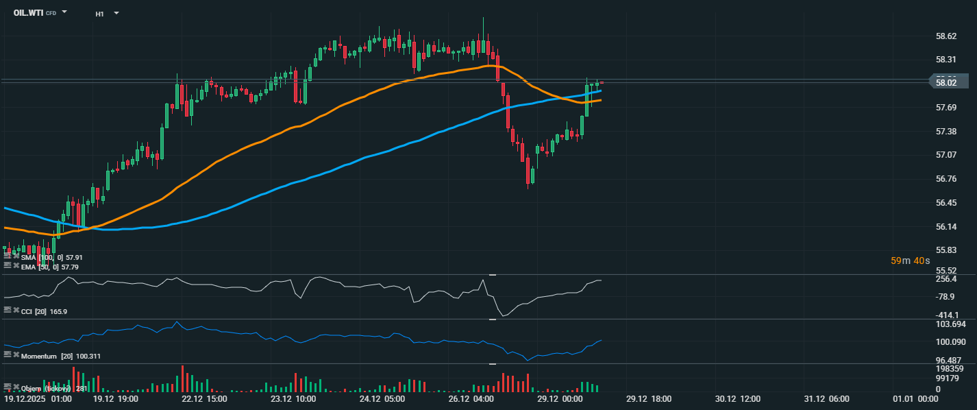 Z technického pohledu bude důležité sledovat, zda se ceně podaří udržet nad úrovní 58 USD. Pokud ano, může to otevřít prostor pro další růst směrem k předchozím maximům okolo 58,60–59 USD. Naopak případné selhání nad touto hranicí může vést ke krátkodobé korekci zpět k zóně podpory kolem 57,30–57,00 USD, kde se nachází EMA 50.