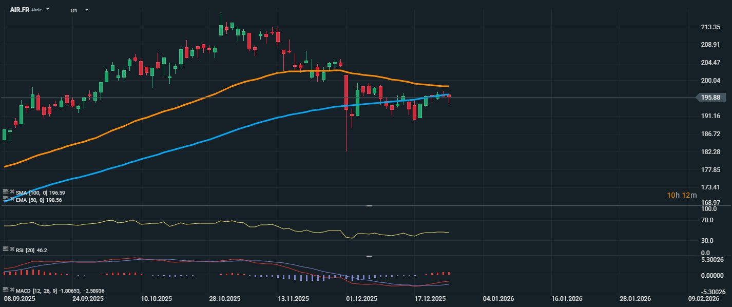 Akcie společnosti Airbus (AIR.FR) se aktuálně obchodují na úrovni 195,88 EUR a technicky se nachází v neutrálním až lehce negativním rozpoložení. Cena zůstává pod oběma klouzavými průměry – EMA 50 (198,56 EUR) i SMA 100 (196,59 EUR), což naznačuje, že trh zatím postrádá silný růstový impuls. RSI se pohybuje na hodnotě 46,2, tedy mírně pod neutrální úrovní, a nesignalizuje ani překoupení, ani přeprodanost. Trh je tak technicky připraven na pohyb kterýmkoli směrem, podle toho, jaké impulzy přijdou.