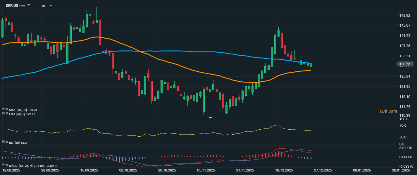 Akcie americké investiční společnosti KKR & Co. se aktuálně obchodují na ceně 130,56 USD a po předchozím silném růstu vstoupily do fáze korekce. Cena se aktuálně drží na úrovni 100denního klouzavého průměru (SMA 100) – 130,76 USD, zatímco EMA 50 se nachází mírně níže na 128,16 USD. Tato zóna kolem 128–131 USD tak tvoří klíčovou technickou oblast podpory, která rozhodne o dalším směru. RSI dosahuje hodnoty 53,3, což značí neutrální nastavení trhu s lehkou tendencí k býčímu výhledu.