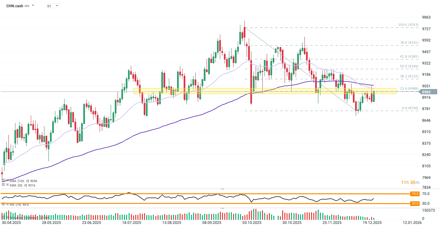 Čínský akciový trh odolal dnešní letargii napříč asijsko-pacifickým regionem a vyčníval výraznými zisky (CHN.cash: cca +1,4 %). Optimismus podpořily IPO dvou společností vyrábějících GPU se zaměřením na umělou inteligenci, což vyvolalo růst celého technologického sektoru, zejména u akcií Baidu (BIDU.US: +4,9 % v after-market obchodování).