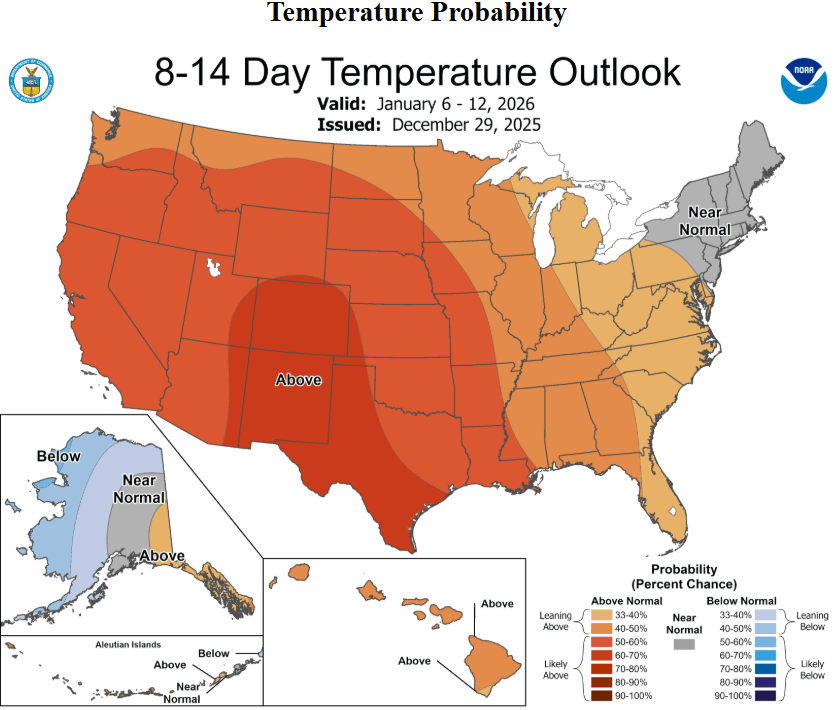 - Nicméně růst by mohl být otestován začátkem ledna, jelikož Climate Prediction Center (NOAA) signalizuje oteplení napříč USA v období od 6. do 12. ledna 2026.