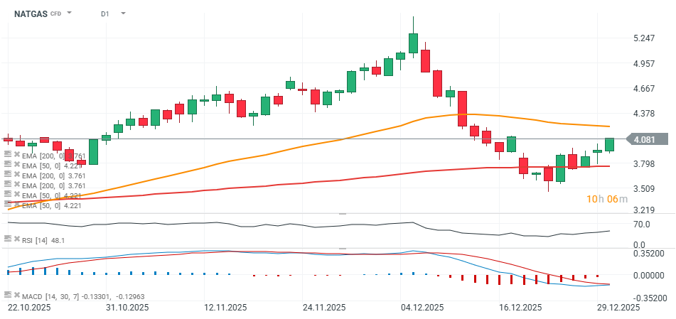 Futures na zemní plyn v USA (NATGAS) dnes rostou o 4 %, v čele s prudkým růstem lednového kontraktu, který vystřelil vzhůru při expiraci. Růst zaznamenaly i kontrakty s pozdějším dodáním. Hlavním býčím faktorem je výrazně chladnější výhled počasí pro severní a západní části USA, kdy od 31. prosince do začátku ledna meteorologické modely ukazují na silnější ochlazení – to zvyšuje očekávání vyšší poptávky po vytápění.