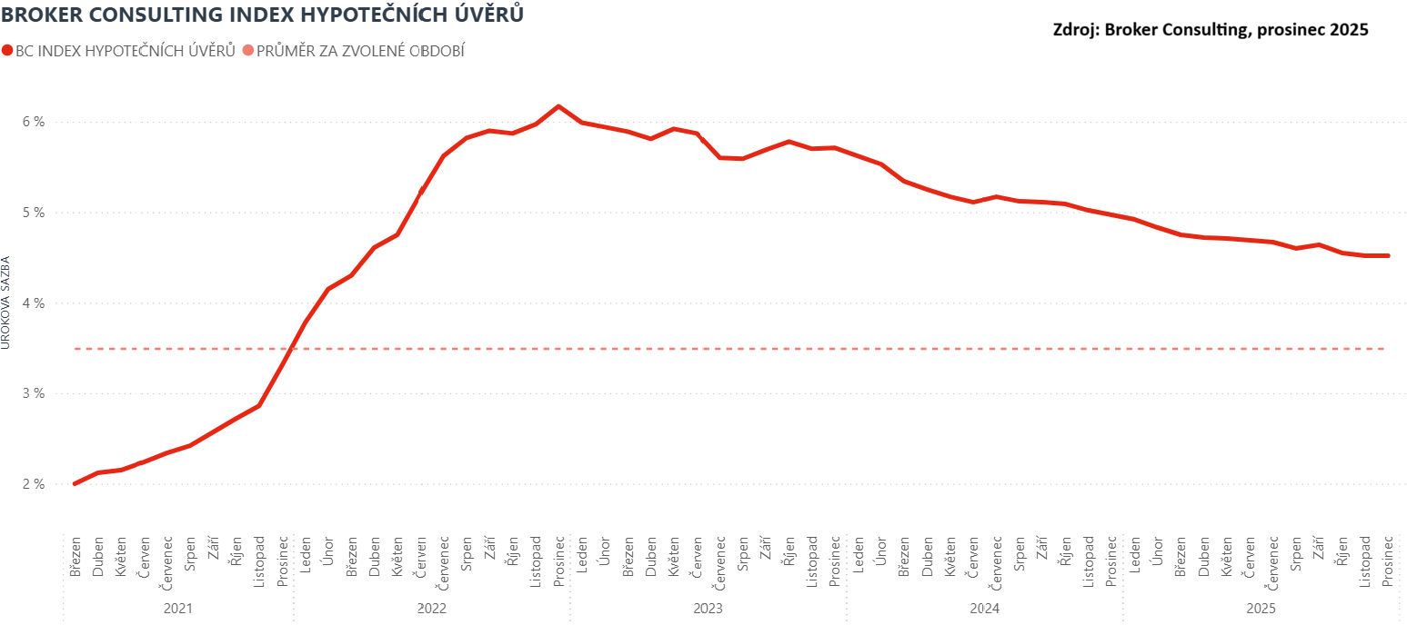 Hypoteční trh vstoupil do závěru roku bez dalšího snížení úrokových sazeb. Podle Broker Consulting Indexu hypotečních úvěrů zůstala průměrná nabídková sazba v prosinci na úrovni 4,52 %. Po měsících postupného snižování tak hypoteční trh vstoupil do nového roku s úrokovou úrovní, která odpovídá současným ekonomickým podmínkám.