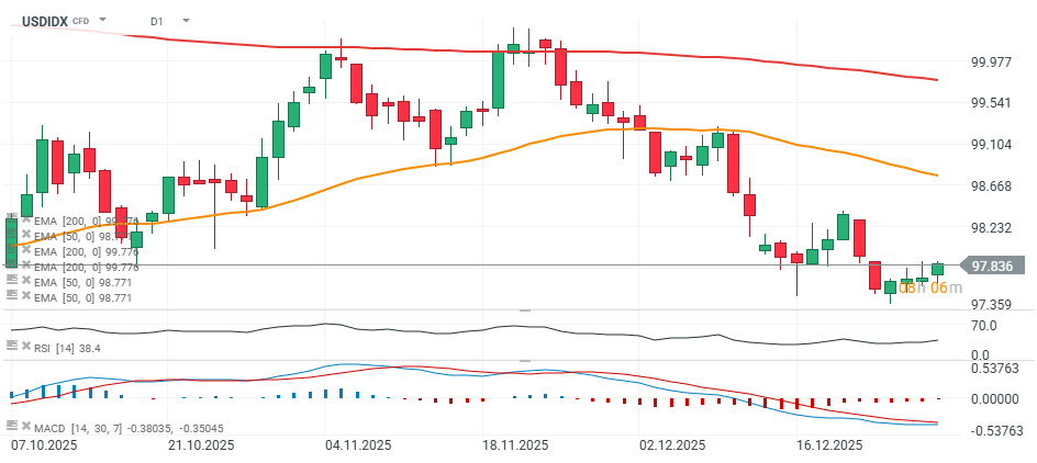 US Chicago PMI za prosinec dosáhl hodnoty 43,5, zatímco se očekávalo 40 a předchozí údaj činil 36,3. Americký dolar dnes mírně posiluje, přesto však jeho reakce na lepší než očekávaná data z oblasti Chicaga zůstává tlumená.