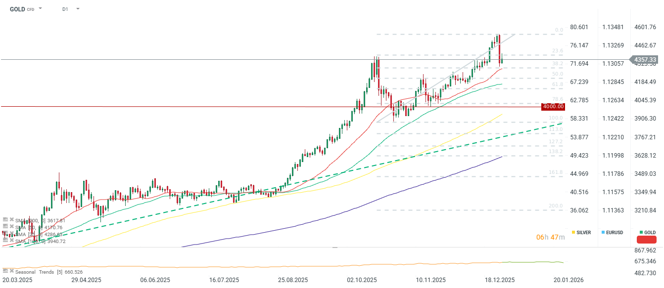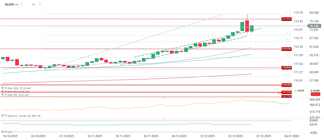 Zlato dnes zaostává za stříbrem a naráží na rezistenci na úrovni 23,6% Fibonacciho retracementu. Oblast poptávky mezi 25denním a 50denním klouzavým průměrem, stejně jako hladina 4 300 USD, však zůstává zachována. Rozšiřující se mezera mezi těmito klouzavými průměry nicméně naznačuje, že krátkodobé nadhodnocení zůstává možné.