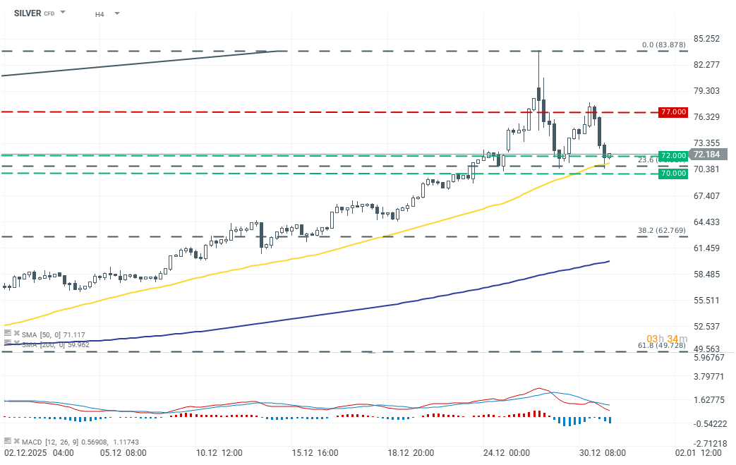 Z širšího tržního pohledu zůstávají dlouhodobé fundamenty podpůrné, nicméně poslední růstová vlna byla mimořádně strmá, což vytváří prostor pro hlubší krátkodobou korekci a znovuotestování klíčových technických úrovní. Rozhodnutí Číny zpřísnit exportní kontroly, které de facto povýšilo stříbro na strategickou komoditu, zvýšilo zájem o fyzický trh a přispělo k dřívějším růstům cen, přičemž kupci v Asii platili prémie nad spot. Na současných úrovních poblíž klíčového supportu by obnovení býčího momenta vyžadovalo denní uzavření nad úrovní 23,6% retracement. Neudržení této oblasti, zejména v kombinaci s testem 50-SMA na H4, může signalizovat krátkodobý obrat trendu.