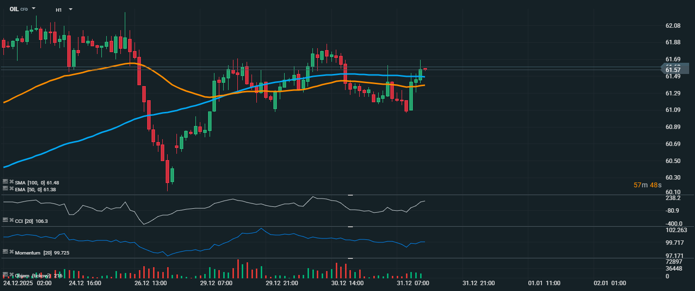Z hlediska technické struktury trhu bude klíčové sledovat, zda se cena udrží nad klouzavými průměry, protože v opačném případě by mohlo jít o falešný průraz. Naopak udržení nad úrovní 61,50 USD otevírá prostor pro růst směrem k 61,80 až 62,00 USD, kde se nachází předchozí rezistenční zóna.