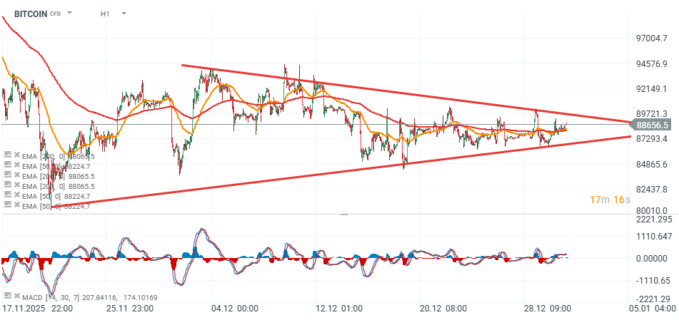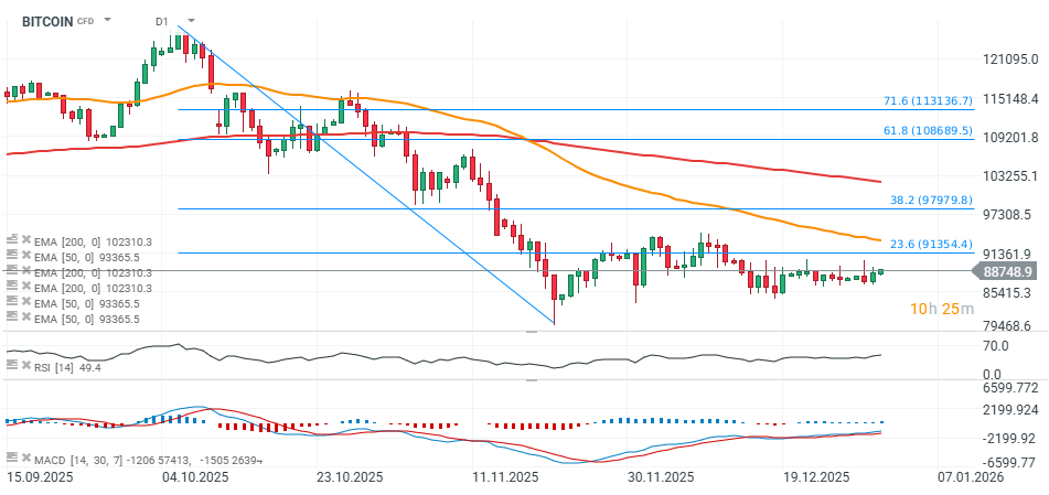 Z pohledu Fibonacciho retracementu (např. úroveň 23,6 %) se oblast kolem 91 500 USD jeví jako významná rezistenční zóna, podpořená předchozími cenovými reakcemi. EMA50 a EMA200 se aktuálně nacházejí přibližně na 93 500 USD (blízko nedávných lokálních maxim) a 103 000 USD. Oblast 91 500–93 500 USD tak může představovat zásadní zátěžový test pro býky. Důležité je, že klesající kanál, který směřoval Bitcoin dolů až do začátku prosince, byl prolomen. Cena se nyní pohybuje v konsolidačním pásmu charakterizovaném velmi nízkou volatilitou.