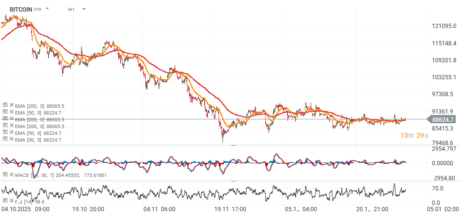 BTC se aktuálně obchoduje téměř 30 % pod podzimním maximem (kolem 126 000 USD). Cena již zaznamenala několik medvědích impulzů, a po tom posledním z 19. listopadu se Bitcoin snaží udržet na klíčových úrovních podpory.