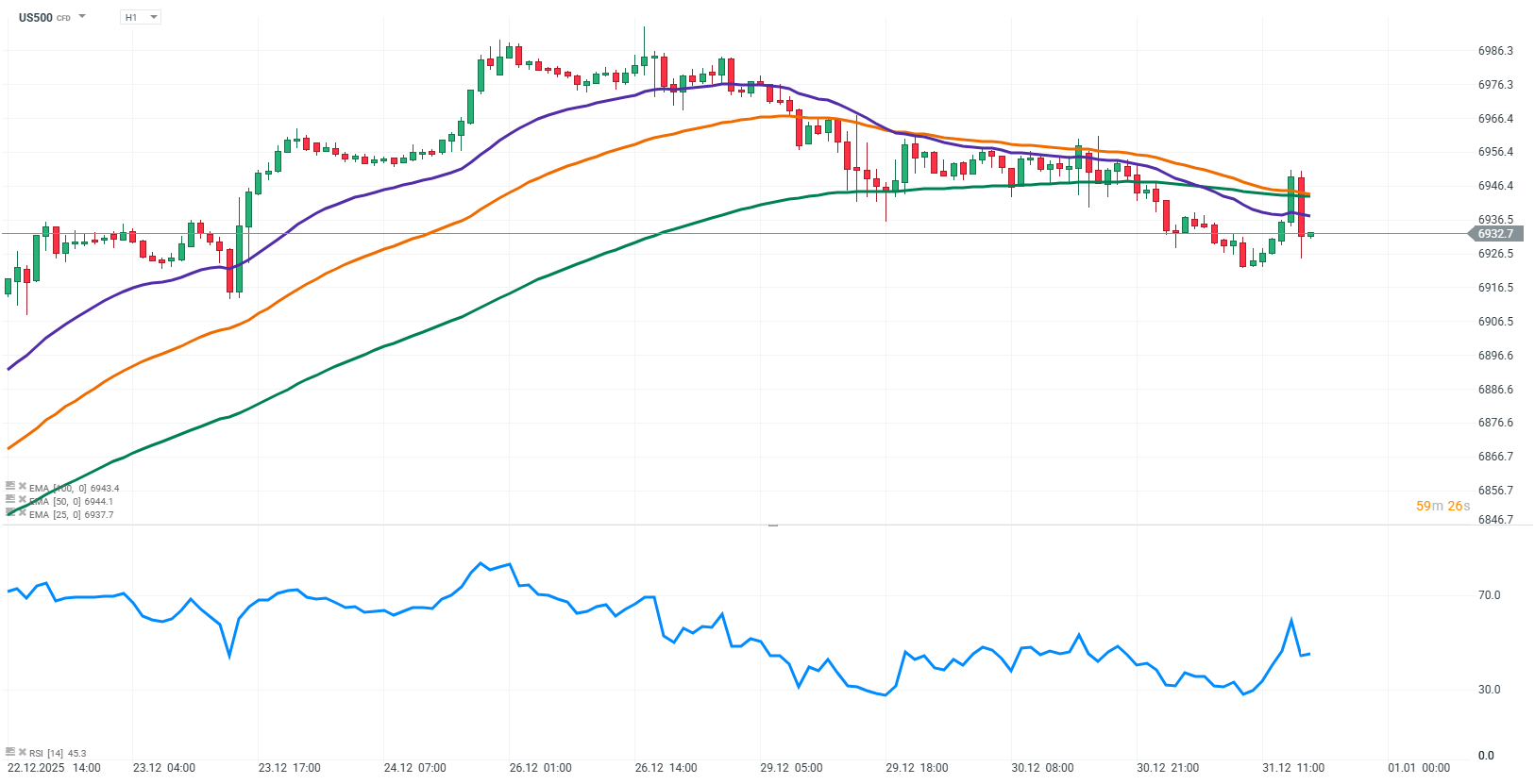 Futures na S&P 500 (US500) mírně korigují po předchozích růstech, což naznačuje korekční vývoj na hodinovém grafu. Cena se pokouší odrazit od nedávných poklesů, ale krátkodobý klouzavý průměr EMA 25 zůstává pod EMA 50 a EMA 100. Klíčová rezistence na úrovni EMA 100 zatím nebyla překonána. RSI ukazuje na převahu prodejců, ale bez výrazně přeprodaného signálu. Trh vyčkává, zda proražení EMA 100 spustí nový růst, nebo zda cena zůstane v současném pásmu.