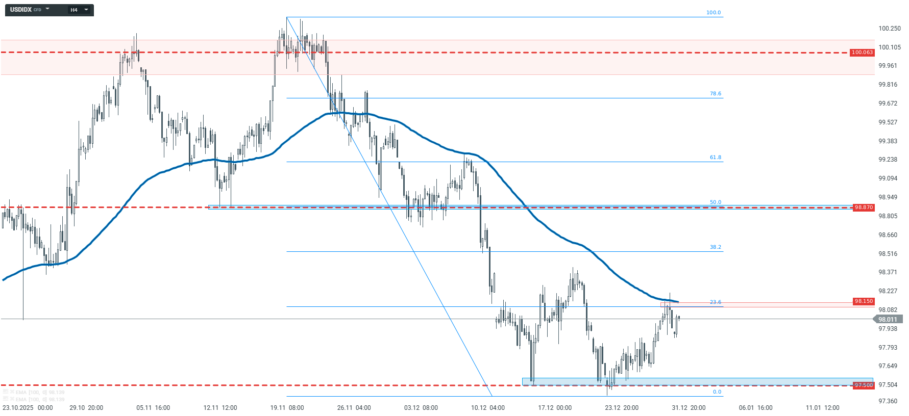 Dolarový index (USDIDX) je už delší dobu v klesajícím trendu. Lokální maximum bylo vytvořeno 21. listopadu 2025, poté jsme pozorovali stabilní pohyb směrem dolů. Cena klesla na 97,50, která byla v polovině prosince otestována dvakrát. V tuto chvíli však nejsou vidět spolehlivé signály obratu trendu. V posledních dnech se cena odrazila od 100periodického klouzavého průměru, který je v grafu vyznačen modrou linií, a zároveň narazila na rezistenci vyplývající z úrovně 23,6 % Fibonacci retracement.