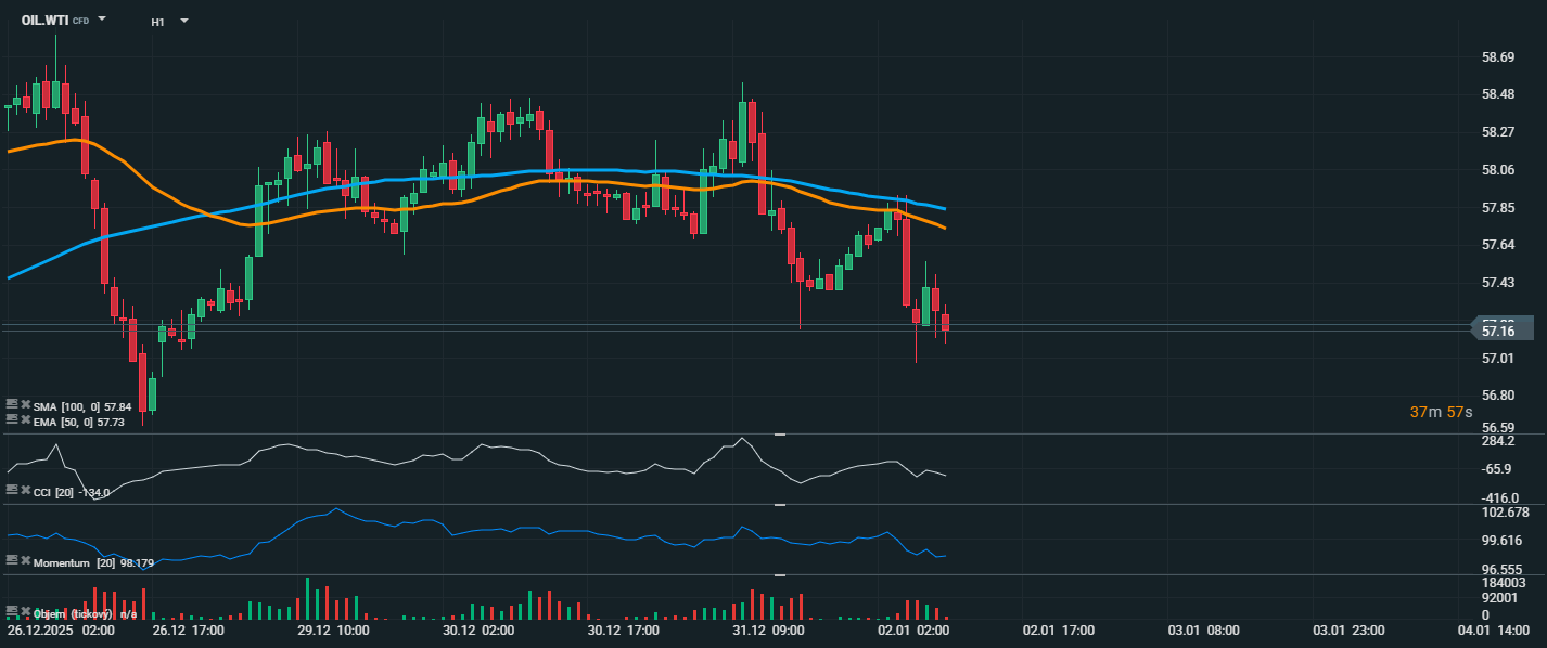 Ceny ropy zahájily nový rok bez větších pohybů, když se obchodníci snaží vyrovnat s kombinací geopolitických rizik a obav z přebytku nabídky. Ropa Brent se v úvodu roku 2026 obchoduje za 60,81 USD za barel, zatímco americká WTI klesla mírně na 57,39 USD. Oba hlavní benchmarky za sebou mají nejhorší roční výkon od roku 2020, přičemž v roce 2025 odepsaly téměř 20 % hodnoty.