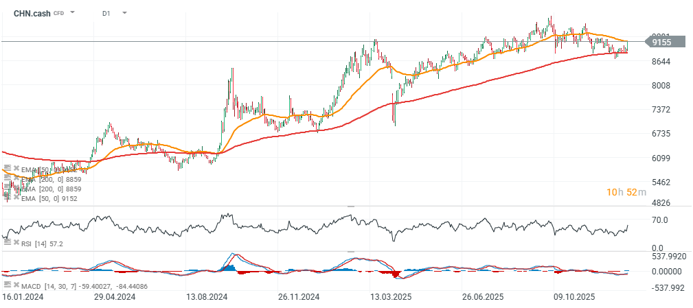 Futures na čínský akciový index obchodovaný v Hongkongu dnes rostou o více než 3 % a vracejí se k oblasti 9 150 bodů poté, co se odrazily od EMA200 a znovu prorazily nad EMA50 (oranžová linie). Na začátku roku podávají emerging markets (EM) – vedené Čínou – silný výkon, podpořený očekáváním slabšího dolaru a širším trendem diverzifikace mimo „drahé“ americké akcie z Wall Street.