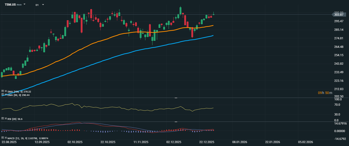 Akcie společnosti TSMC se po listopadové korekci stabilizovaly a v posledních dnech opět posilují. Aktuálně se obchodují na úrovni 303,87 USD, přičemž se cena nachází nad klouzavými průměry EMA 50 (290,44 USD) i SMA 100 (278,22 USD). To potvrzuje býčí technické nastavení a pokračující růstový trend. RSI se pohybuje na hodnotě 56,6, což značí neutrální až mírně pozitivní momentum, bez známek překoupenosti. Pokud akcie udrží současnou dynamiku, může dojít k ataku rezistenční zóny v oblasti 305–310 USD. Naopak support lze hledat v oblasti kolem 290 USD, kde se nachází EMA 50 a zároveň dřívější úroveň konsolidace.