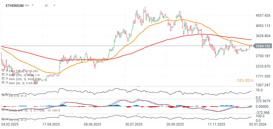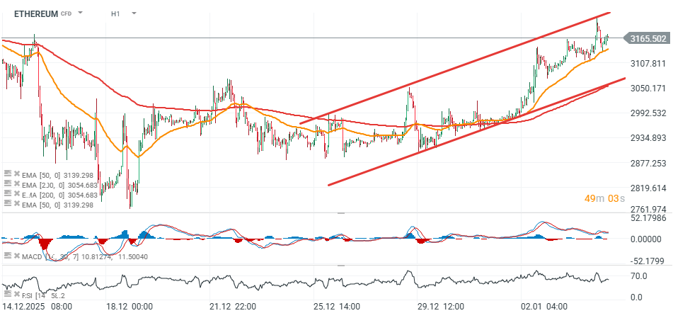 Podobně jako Bitcoin i Ethereum dnes roste na úrovně, které jsme naposledy viděli v polovině prosince. Krátkodobou podporu signalizuje EMA50 na hodinovém grafu (okolo 3 100 USD), zatímco spodní hranice cenového kanálu se nachází kolem 3 050 USD, kde zároveň leží EMA200 (červená linie).