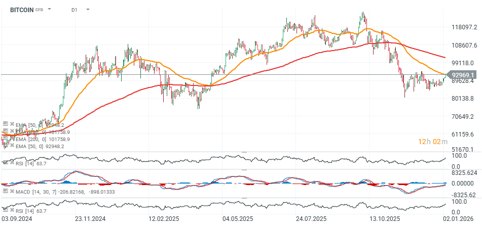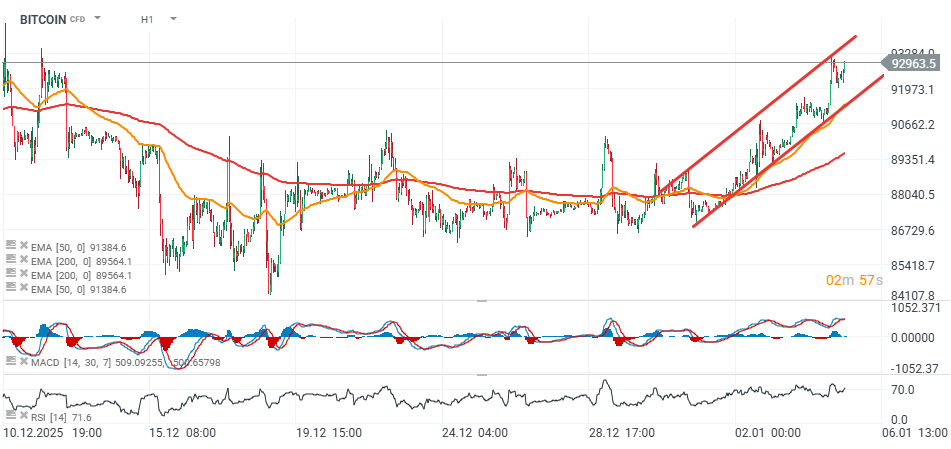 Bitcoin dnes roste směrem k 93 000 USD, což je nejvyšší úroveň od první poloviny prosince 2025, a to na pozadí pozitivní nálady na americkém akciovém trhu, kde futures na Nasdaq 100 a S&P 500 (US100 a US500) posilují před otevřením trhů.