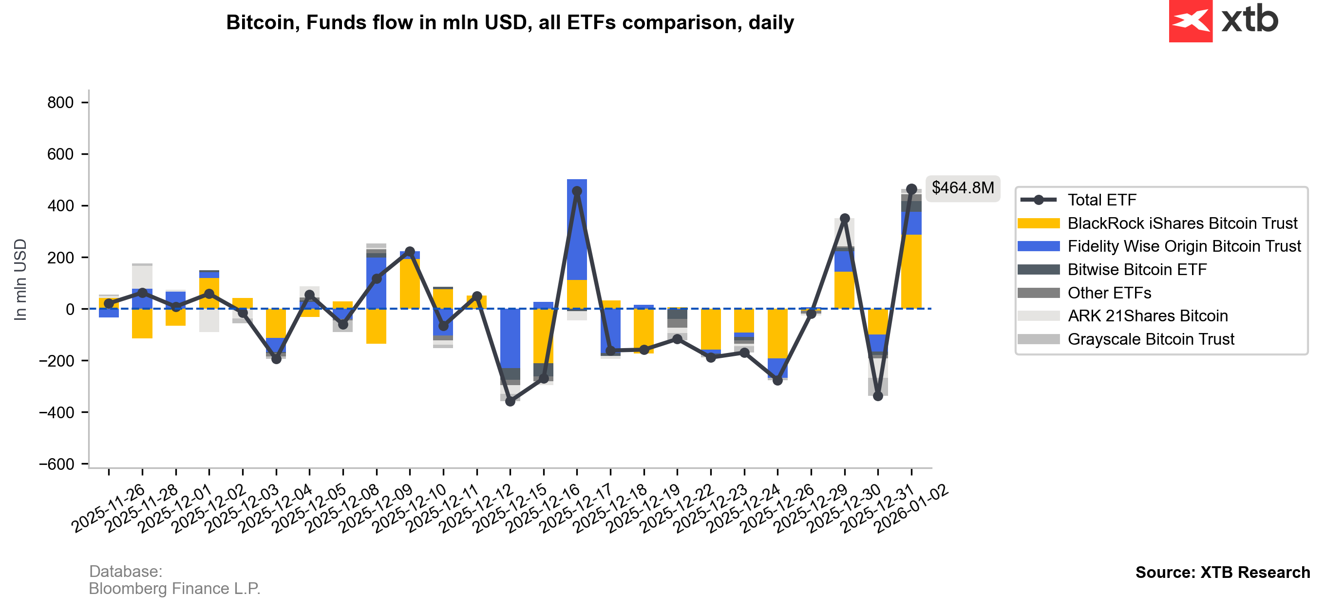 Během poslední obchodní seance minulého týdne (pátek) zaznamenaly ETF na BTC a ETH přílivy ve výši 464 mil. USD a 124 mil. USD.