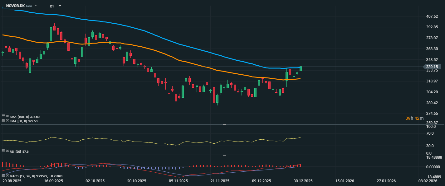 Akcie společnosti Novo Nordisk se aktuálně obchodují na úrovni 339,15 DKK, přičemž se jim podařilo prorazit nad klouzavý průměr SMA 100 (337,60 DKK) i nad EMA 50 (322,53 DKK). Tato situace představuje pozitivní technický signál, který může naznačovat začátek změny trendu. RSI se nachází na úrovni 57,6, což ukazuje na rostoucí nákupní zájem, ale zároveň stále ponechává prostor pro další růst, aniž by trh vstoupil do překoupené oblasti.