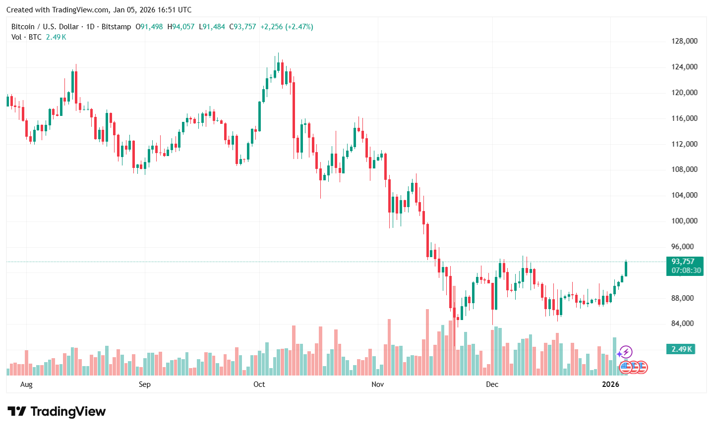 Bitcoin (BTC) začal rok 2026 velmi pozitivně, když se jeho cena v pondělí vyšplhala nad hranici 92 000 USD, což je úroveň, kterou trvaleji nedosahoval od konce loňského roku. Po bouřlivém závěru roku 2025 tato technická i psychologická hranice naznačuje, že momentum na trhu se překlápí ve prospěch býků a může jít o začátek širšího oživení největší kryptoměny.