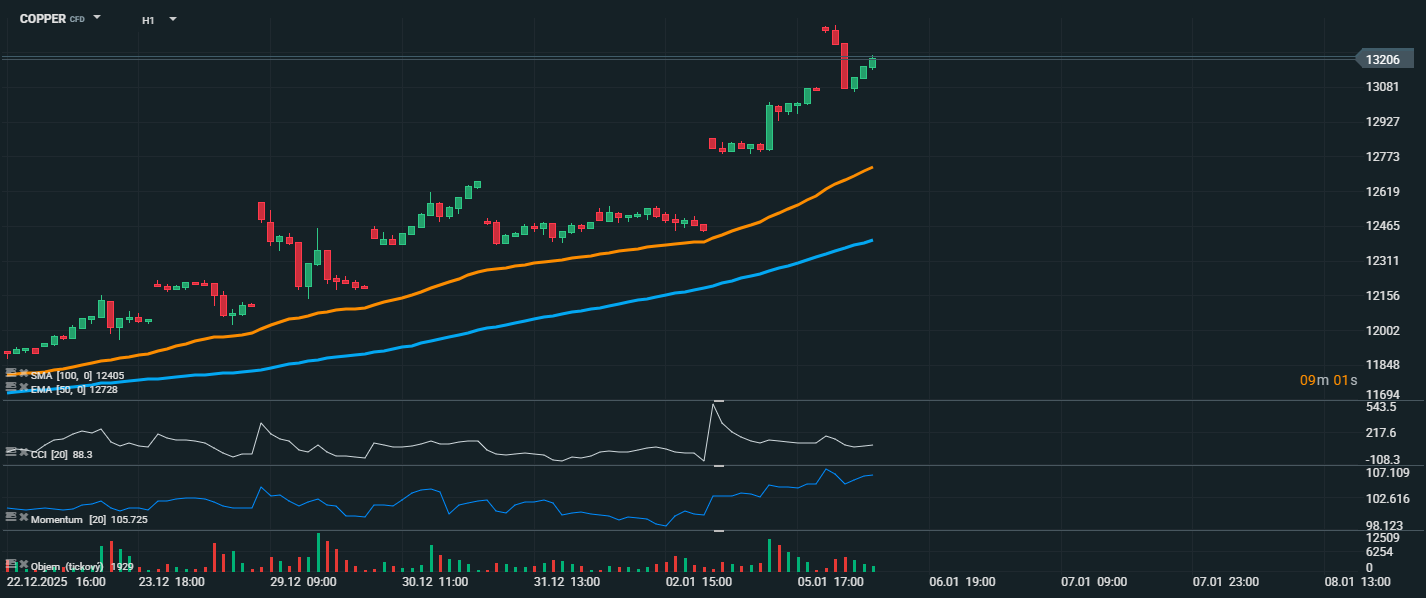 Cena mědi pokračuje v dynamickém růstu a aktuálně se obchoduje na úrovni 13 206 USD za tunu, což potvrzuje silné býčí momentum. Tento pohyb navazuje na předchozí průraz klíčové psychologické hranice 13 000 USD a odráží zvýšenou aktivitu investorů. Exponenciální klouzavý průměr EMA 50 je na hodnotě 12 728 USD a prudce roste, což svědčí o silném krátkodobém trendu. Jednoduchý klouzavý průměr SMA 100 se nachází na 12 405 USD, hluboko pod aktuální cenou, a podporuje dlouhodobější růstovou tendenci. Momentum je na hodnotě 105,7, což potvrzuje zrychlující se tempo růstu a sílu kupců. CCI dosahuje úrovně 88,3, tedy v pásmu překoupenosti, což může signalizovat možnost krátkodobé konsolidace nebo mírného ochlazení tempa. Obchodní objemy v posledních hodinách mírně kolísají, ale zůstávají nadprůměrné, což podporuje důvěryhodnost průrazu. Cena vytvořila nová lokální maxima a korekce z posledních hodin byla rychle vykoupena, což ukazuje na tržní chuť k dalším nákupům.