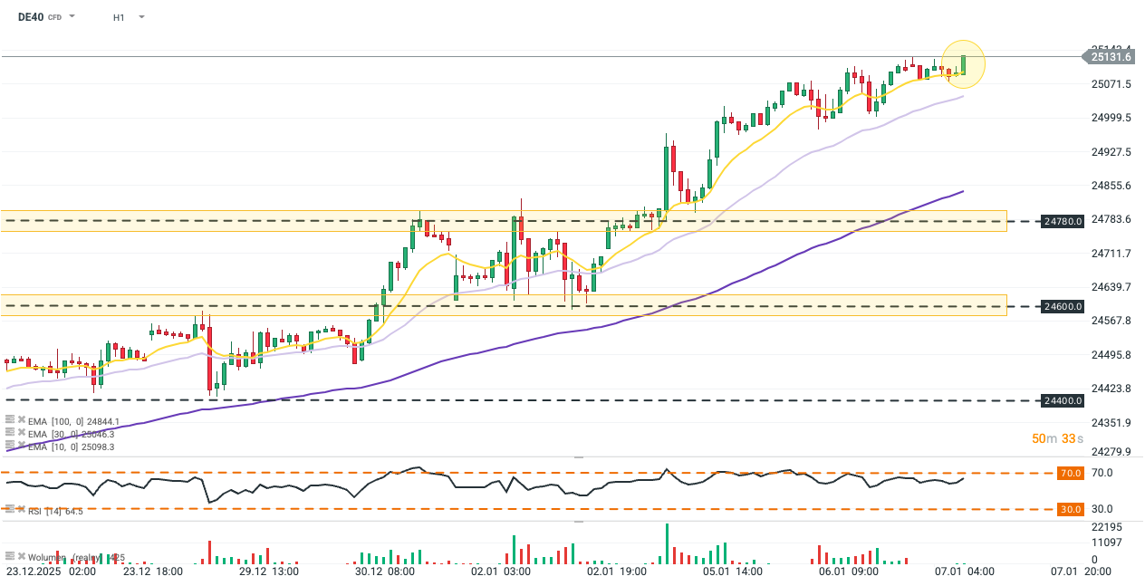 DE40 obnovil býčí momentum poté, co se odrazil od 10hodinového exponenciálního klouzavého průměru (EMA10, žlutá). RSI se pohybuje těsně pod překoupeným pásmem, což naznačuje, že prostor pro další růst může být omezený. S blížícími se novými rekordními maximy mohou být další zisky limitovány směrem k závěru seance, zejména pokud nadcházející data z USA oslabí chuť k riziku.
