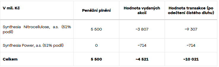 Kupní cena může být v průběhu 1Q 2026 dodatečně upravena o skutečnou výši čistého dluhu a pracovního kapitálu společnosti Synthesia Nitrocellulose k 6. 1. 2026.