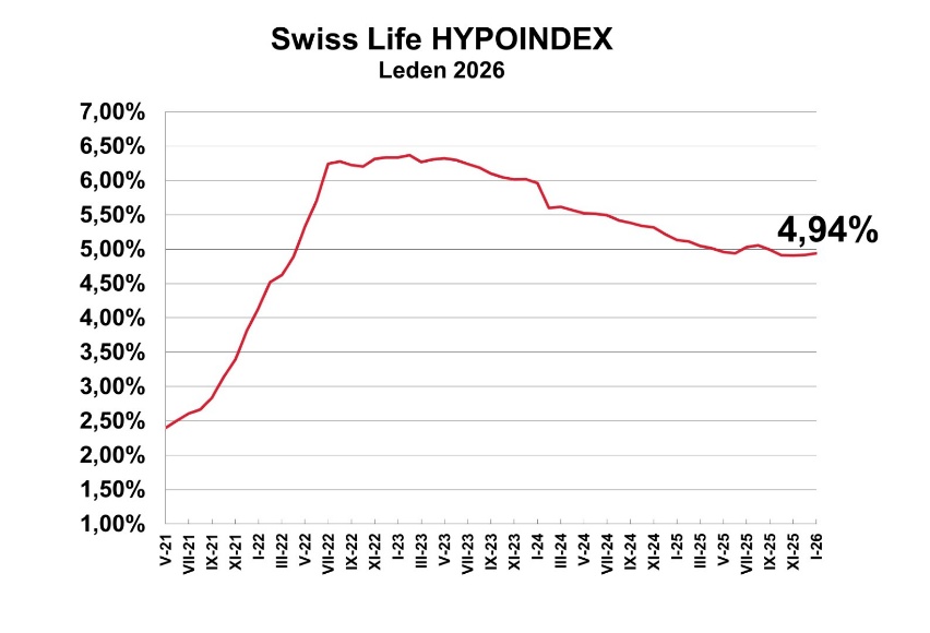 Pokles hypotečních sazeb se zastavil a začátek roku 2026 přinesl první mírný růst. Podle Swiss Life Hypoindexu se průměrná nabídková sazba v lednu zvýšila na 4,94 %, což znamená nárůst o tři bazické body. Jde o první drobný růst sazeb od loňského léta. Podle expertů Swiss Life Select se hypoteční trh dostal do fáze stagnace, ve které je racionálnější řešit financování než vyčkávat na další pokles sazeb.