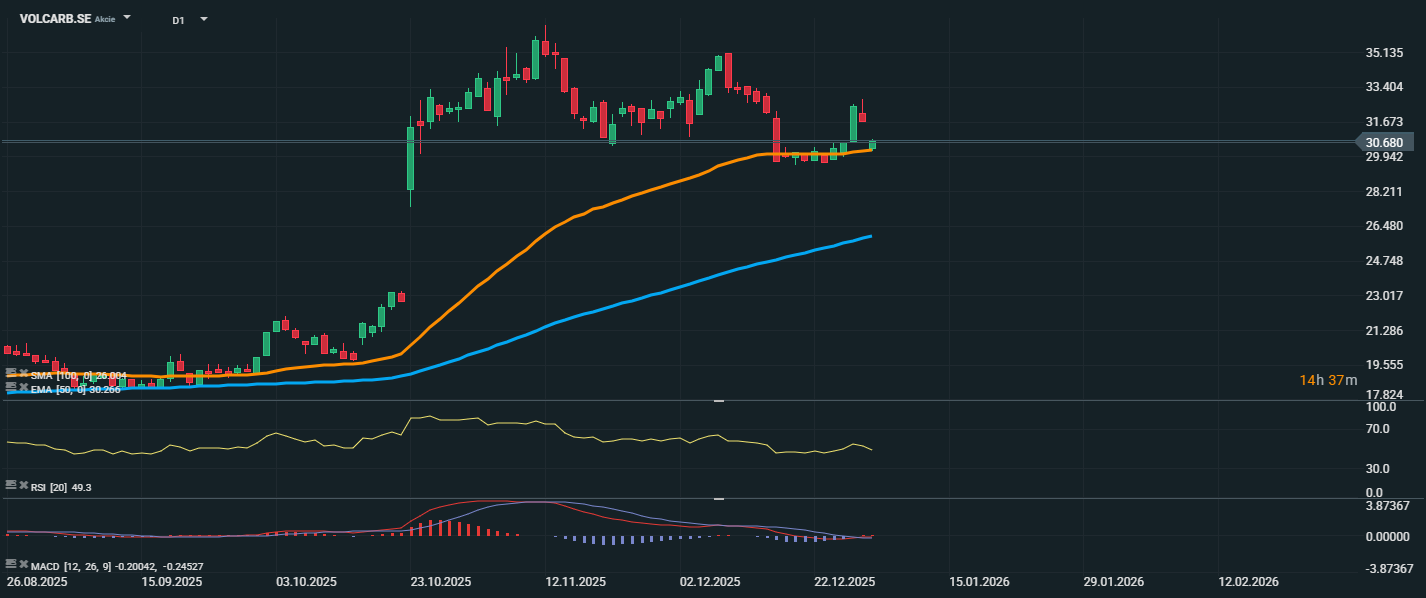 Akcie společnosti Volvo Cars se aktuálně obchodují na úrovni 30,68 SEK, přičemž cena v posledních dnech prorazila z konsolidační zóny nad úroveň krátkodobého klouzavého průměru EMA 50 (30,26 SEK) a testuje oblast těsně nad touto hodnotou. Dlouhodobější SMA 100 (26,89 SEK) zůstává bezpečně pod aktuální cenou, což potvrzuje stále platný býčí střednědobý trend. RSI se nachází na hodnotě 49,3, tedy v neutrální zóně, což značí rovnováhu mezi nákupním a prodejním tlakem a zároveň prostor pro potenciální pokračování růstu bez překoupení trhu. Pokud se akciím podaří udržet nad EMA 50, může dojít k otestování nedávných maxim v oblasti kolem 33–35 SEK. Naopak nejbližší podpora se nachází právě v zóně 30,20–29,90 SEK, jejíž prolomení by znamenalo návrat do fáze konsolidace.