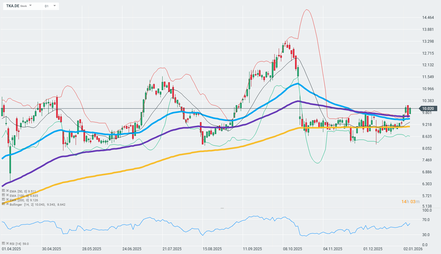 Další podporu pozitivnímu sentimentu vůči skupině přinesla nová doporučení od Deutsche Bank týkající se dceřiné společnosti Thyssenkrupp Nucera (NCH2.DE). Analytici zvýšili své hodnocení z „držet“ na „koupit“, přičemž uvedli, že aktivita společnosti se blíží tržnímu dnu a současné cenové úrovně mohou nabídnout atraktivní vstupní bod. Ačkoliv byla cílová cena snížena z 12 EUR na 11 EUR, analytik Michael Kuhn zdůraznil, že Nucera má solidní fundamenty a připravuje se na nový růstový cyklus v oblasti zelené energie.