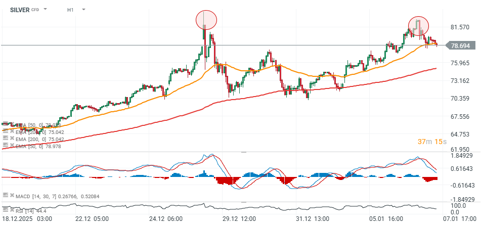 Cena stříbra na začátku roku zahájila novou, silnou růstovou vlnu, která posunula kov z úrovně kolem 70 USD až téměř k 82 USD, čímž se přiblížila historickému maximu z konce prosince 2025. Včera však začal pokles, během něhož stříbro oslabilo přibližně o 5 % z lokálního vrcholu na 78 USD a nyní ztrácí momentum nad EMA50 (oranžová linie). RSI se aktuálně nachází těsně pod 45, zatímco MACD signalizuje možné medvědí překřížení.