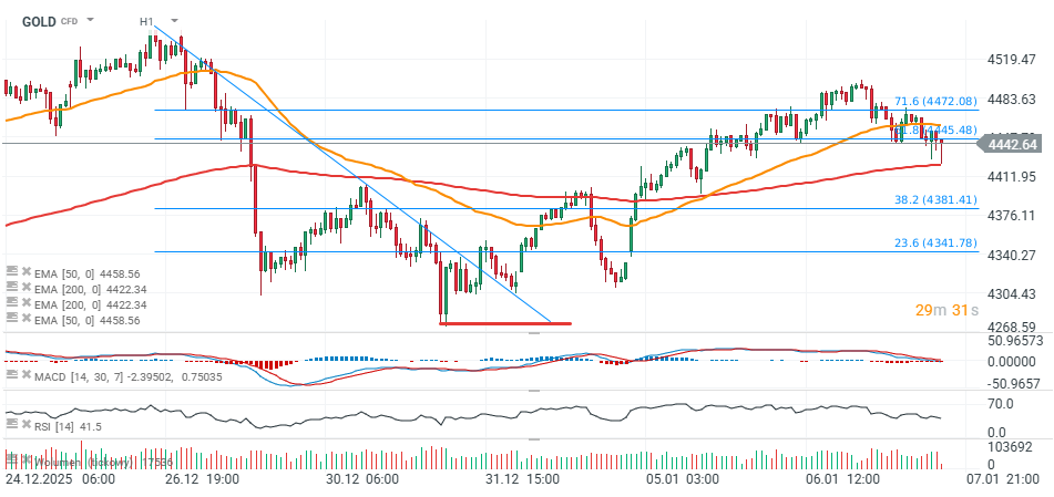 Na hodinovém grafu se pokles zastavil okolo 4 420 USD (EMA200, červená linie), ale cena zůstává pod úrovněmi 71,6 % a 61,8 % Fibonacciho retracementu z poklesu na konci prosince. Nejbližší rezistence se nachází u EMA50 (oranžová linie) kolem 4 460 USD za unci.