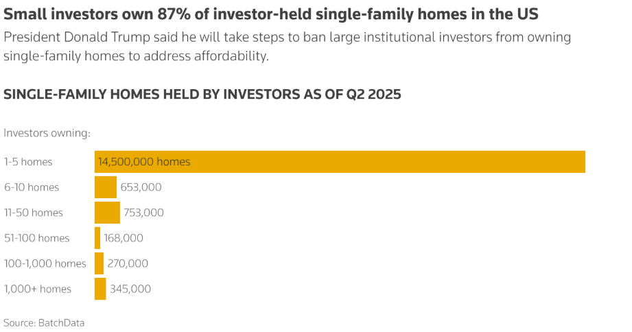 Trump oznámil zákaz nákupů rodinných domů velkými fondy, což dočasně snížilo tržní kapitalizaci společnosti Blackstone o přibližně 17 miliard dolarů, ale samotné „mega“ fondy představují pouze asi 2–3 % všech transakcí na trhu rodinných domů, což znamená, že odstranění tohoto segmentu poptávky výrazně nezmění ceny, protože hlavním problémem trhu je velmi nízká nabídka, vyplývající mimo jiné z vlastnictví investorů a vysokých úrokových sazeb.