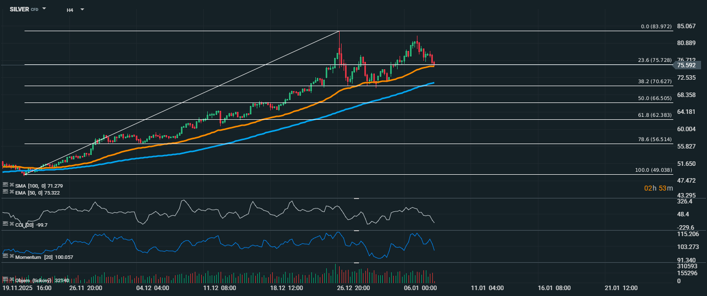 Cena stříbra koriguje předchozí růst a aktuálně se obchoduje těsně nad hladinou EMA 50 (75,32 USD), která se spolu s Fibonacciho úrovní 23,6 % (75,72 USD) stává klíčovou technickou podporou. Přestože se trh nachází v krátkodobém poklesu, dlouhodobý trend zůstává býčí, což potvrzuje i skutečnost, že cena je stále výrazně nad SMA 100 (71,27 USD). CCI se propadl pod -100, což značí, že trh se momentálně nachází v přeprodané oblasti, a může tedy dojít k odrazu zpět vzhůru. Momentum zůstává v kladných hodnotách, i když mírně oslabuje, což naznačuje zpomalení růstové dynamiky, nikoli její úplný konec. Fibonacciho retracementy vyznačují důležité úrovně podpory pro případ hlubší korekce. Nejbližší silnou podporu lze nalézt v oblasti 70,63 USD (38,2 % retracement). Pokud by tato zóna neobstála, další technické úrovně podpory jsou na 66,50 USD (50 %) a 62,38 USD (61,8 %). Celkově lze říci, že cena stříbra se aktuálně nachází v krátkodobé korekci v rámci dlouhodobého rostoucího trendu. Dokud cena zůstává nad SMA 100, zůstává býčí výhled zachován.