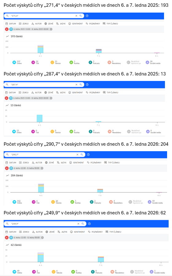 Letos tedy ovšem nastala jiná situace z hlediska přijetí zprávy ministerstva financí. I když Babišova vláda plně pokračovala v loňské metodice vlády Fialovy, takže peníze na projekty EU zahrnula, tudíž schodek za rok 2025 vyčíslila v souladu s tím na 290,7 miliardy korun. Zvedla se však mediální vlna, že jde o špatný údaj. A že prý je správný údaj 249,9 miliardy korun. Cifra bez zahrnutí evropských peněz se tak náhle v českých médiích objevila v dané souvislosti ve dnech 6. a 7. ledna 2026 (údaj byl v podobě tiskové zprávy ministerstva financí zveřejněný 6. ledna 2026 ve 12:15) v 62 případech z 266 (23 %).