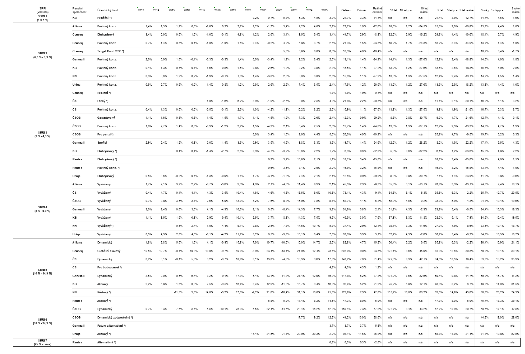 Poznámka 1: Analýza vychází z dat o výkonnosti ke dni 31. prosince 2025 (jedinou výjimkou je Conseq Realitní, kdy je údaj k 30.12.2025) a hodnot údaje SRRI zveřejněných jednotlivými penzijními společnostmi ke dni 6. ledna 2026.